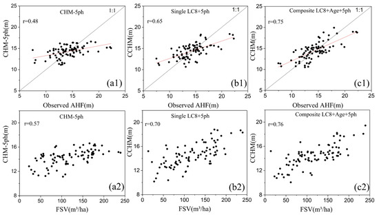 The scatterplots between CHM, AHF and FSV: (a1) is the scatterplot between 5ph and AHF; (b1,c1) are scatterplots between CCHM derived from single and composite LC8 and AHF, respectively; (a2–c2) are the scatterplots between 5ph, CCHM and FSV.