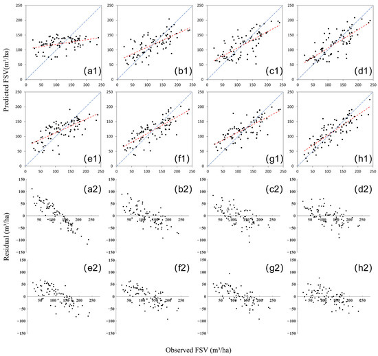 To further analyze the contribution of various variables, Figure 10(a1–h1) illustrates the scatterplots between the ground measured and predicted FSV using the models with the highest accuracy of results in each variable set (Table 3). The residuals of each selected model are also plotted in Figure 10(a2–h2). For young samples (stand age: less than 2 years), overestimated results frequently occurred using the variable set extracted from single LC8 images (Figure 10(a1,a2)). The results were significantly improved using the variable set extracted from composite LC8 images (Figure 10(e1,e2). Therefore, it was inferred that composite LC8 images could improve the accuracy of FSV for young eucalyptus forests.