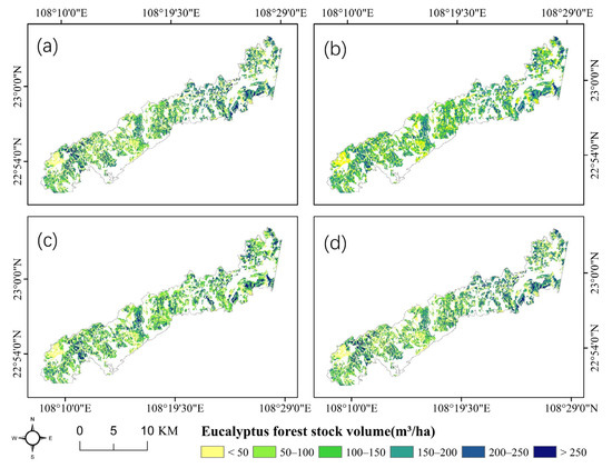 Eucalyptus forests, regarded as one of the fastest-growing tree species, have an outstanding ability to sequester carbon [1,2]. More than one-third of the wood is provided by planted eucalyptus forests in China, which cover 2% of the total planted area [3]. Forest stock volume (FSV) is one of the key parameters for evaluating the ability of sequester carbon [4,5]. In the past, the FSV was mainly obtained by ground measurements, such as the diameter at breast height (DBH) and the average height of forest (AHF) [6,7,8]. However, these methods are time-consuming, laborious, and expensive. Remote sensing images, which provide long-term, large-scale spatial information, have great potential to improve the efficiency of mapping FSV [9,10,11,12,13]. Up to now, several forest parameters have been widely mapped using various optical remote sensing images with different sensors and bands [14,15,16].