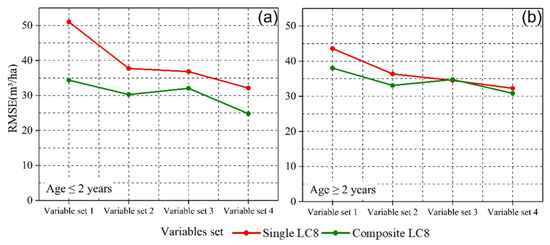 To further analyze the contributions of the crown width, forest height and stand age to map FSV, all samples were divided into two groups based on stand age: the first group is stand age younger than two years old and the rest is the second group (stand age > 2 years). Using the proposed composite images, the overestimated FSV was significantly decreased because of the contribution of the crown width, and Figure 12 illustrates that the contributions of the crown in young samples (RMSE reduced by 15%) is obviously larger than that in near-mature or mature samples (RMSE reduced by 5%). Moreover, the contributions of the crown width gradually faded into insignificance for near-mature or mature eucalyptus forest. These results also indicated that composite LC8 images were more capable of improving the accuracy of FSV in young eucalyptus forests. The main reason is the growth characteristics of the crown; the crown of young eucalyptus grows with an increase in FSV. In contrast, it is rather difficult to obtain a reliable FSV using single LC8 images after crown closure because of saturation problems.