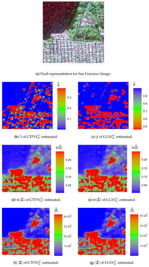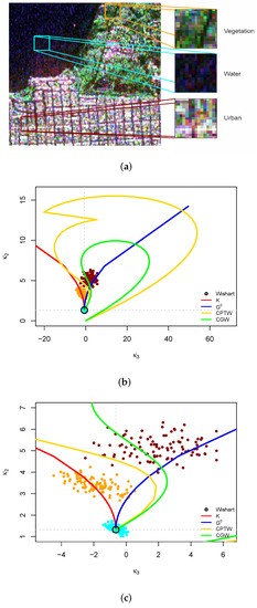 Figure 5f,g show very similar results. The trace and the determinant are able to identify three regions: urban areas appear in green, forests in orange, and ocean in red. In