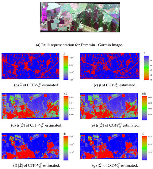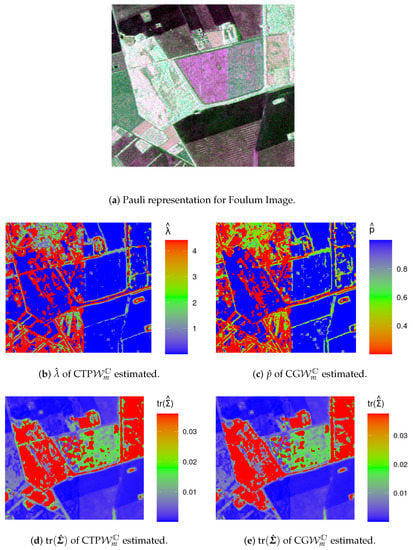 Figure shows values of MLEs for the Foulum image. Maps for and are in Figure b,c. Edges and background areas of the image are highlighted. Figure d,e presents the estimates of tr and . The largest estimates addressed areas of Conifer, Wheat and Rapeseed, while the smallest values were associated with other areas.