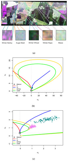 Figure 7b–g, it is possible to identify five kinds of crops: winter rape (yellow), winter wheat (red), maize (green), winter barley (light red) and sugar beet (light green).
