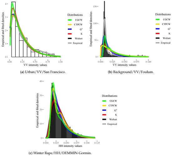 Finally, in order to complement the adequacy study of polarimetric distributions, we compared the fits of their marginal models. The marginal densities of the CTPC