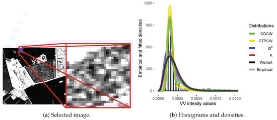 Finally, to illustrate the fitting in a bimodal scenario (beyond regions having only one texture), we select a region from a Foulum image obtained in VV polarisation.
