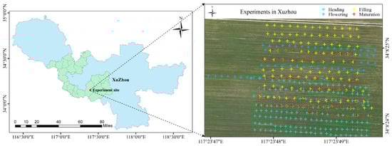 The location of the experimental site selected for this study is the experimental station of the Xuzhou Academy of Agricultural Sciences (XZAAS), in Xuzhou, Jiangsu province of China (117°23′48″E, 34°13′58″N, see Figure 1), where winter wheat (Xumai-33) is the predominant crop in the field, and the area studied was cultivated intensively. The fertilization method was the base fertilizer plus topdressing, with a base fertilizer dosage of 15,000 kg·ha−1 organic fertilizer, 450 kg·ha−1 NPK compound fertilizer (N:P:K = 15:15:15), and urea of 150 kg·ha−1, and a topdressing dosage urea of 225 kg·ha−1 in mid-March 2021. All LAI measurements were set up in a randomized block design, with 557 plots (each has a 1 m2 (1 m × 1 m) area) spanning four growth stages. The 63 and 27 LAI sampling plots of the maturation stage were coincident with those of the flowering and filling stage, respectively. The total area of LAI measurements is around 467 m2 in this study.