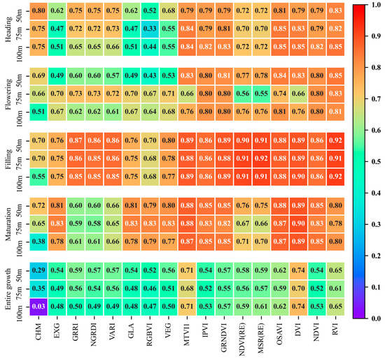 Figure 2 shows the correlation coefficient between the wheat LAI and the UAV-based CHM data, CIs, and VIs at each of the flight altitudes in each of the growth stages (heading, flowering, filling, maturation), respectively, and also the entire growth period. From the most left column, which is for the CHM results, comparing the three values in the same growth stage, we can find that the value at the 50 m altitude was the largest, followed by the 75 m altitude, and the weakest correlation was found at the 100 m altitude. Moreover, if the CHM results from the five different stages were compared, the largest correlation was in the heading stage (top), with the values of 0.80, 0.75, and 0.75 at the 50 m, 75 m, and 100 m altitudes, respectively. These results reveal the potential of using the CHM data in the modelling of the wheat LAI, which is for the prediction of the wheat LAI.