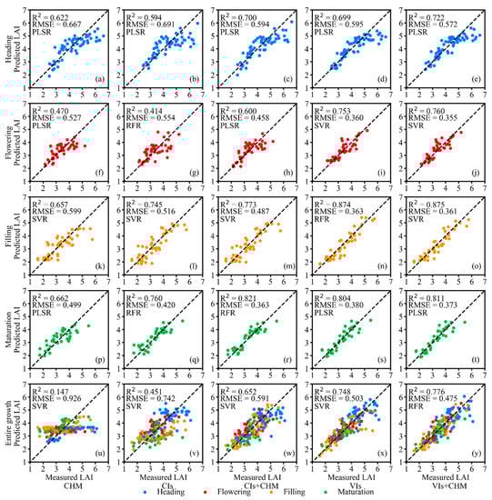Figure 3u–y shows the scatter plots for measured versus predicted LAI from optimal LAI fitting models in the entire growth period. It could be found that the combination of the CHM and spectral data led to the data points closer to the 1:1 line than the cases of using the CHM or spectral data only.