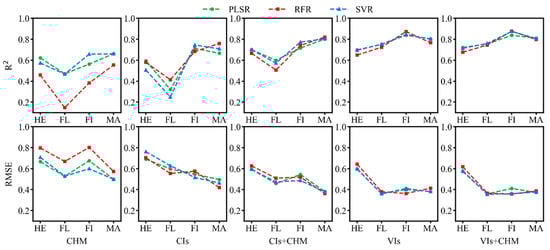 In this section, the following five combinations of data were used as the input data of the LAI fitting models developed using the PLSR, RFR, and SVR methods over the entire growth period: (1) CHM, (2) CIs, (3) CIs + CHM, (4) VIs, and (5) VIs + CHM. The PLSR, RFR, and SVR fitting models were tested using an out-of-sample dataset (i.e., the test data were not used in the modelling) and the results are shown in Table 6.