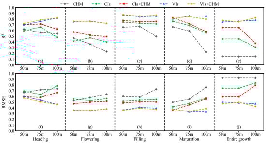 R2 (a–e) and RMSE (f–j) of LAI values predicted by the optimal LAI fitting models resulting from the combination of CIs and the CHM data from 50 m, 75 m and 100 m flight altitude in each growth stage, respectively. The x axis number represents the combination of the CIs and CHM data obtained at the different flight altitudes.