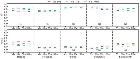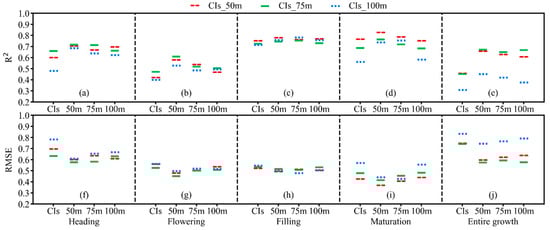 From the R2 and RMSE results of the CIs-only case (green in each pane) in the heading, flowering and entire growth period, one can see that the highest accuracy of the LAI prediction was at the 75 m altitude, followed by 50 m and 100 m; while in the other two stages, the accuracy of the LAI prediction decreased with the decrease in spatial resolution. Moreover, the accuracy of the CIs + CHM results in each growth stage was obviously improved for all flight altitudes compared with the results of the CIs-only case, meaning the contribution made by the use of the CHM data in the LAI modeling based on RGB imagery.