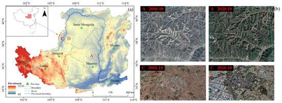 MOD13A1, MOD11A2 and MOD09A1 products in the article are available at https://earthengine.google.com/, accessed on 13 February 2022. DEM data in the article are available at https://earthexplorer.usgs.gov/. Socio-economic statistics data are derived from http://www.shanxi.gov.cn/sj/tjnj/, https://www.nx.gov.cn/zwgk/zfxxgk/fdzdgknr/tjxx_40901/tjnj/, http://tjj.shaanxi.gov.cn/, http://tjj.qinghai.gov.cn/tjData/qhtjnj/, https://tjj.henan.gov.cn/tjfw/tjcbw/tjnj/, http://gsdfszw.org.cn/gsnj/gsnj/ and http://tj.nmg.gov.cn/tjyw/jpsj/index_1.html, accessed on 13 February 2022. Population density data in the article are from https://sedac.ciesin.columbia.edu, accessed in 2000, 2010 and 2020. Land use data provided in the article are available at http://www.globallandcover.com, accessed on 13 February 2022.