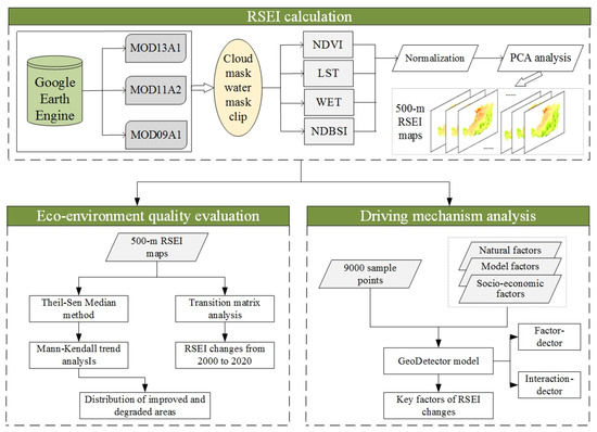The Loess Plateau is a typical ecologically sensitive area that can easily be perturbed by the effects of human activities and global climate change. Therefore, it is necessary to develop tools to monitor the environmental quality in the LP quickly and accurately. To reveal the spatio-temporal changes in environmental quality in the LP from 2000 to 2020, we used the Moderate-Resolution Imaging Spectroradiometer (MODIS) products on the Google Earth Engine platform and constructed the remote sensing ecological index (RSEI) through principal component analysis (PCA). Then, Sen–Mann–Kendall methods were applied to determine the changing trend of the environmental quality of the LP. Finally, natural and anthropogenic factors affecting the environmental quality were probed using a geographical detector model. The results showed that: (1) the average RSEI values in 2000, 2010 and 2020 were 0.396, 0.468 and 0.511, respectively, displaying an upward trend from 2000 to 2020, with a growth rate of 0.005 . The overall environment quality was moderate (0.4–0.6). (2) In terms of spatial distribution, the environmental quality was excellent in the southeast and poor in the northwest of the LP. The areas with improved environmental quality (84.51%) were located in all the counties, whereas the areas with degraded environmental quality (8.11%) occurred in the north and southeast of the study area. (3) Greenness, heat, wetness, dryness and land use types were prominent factors affecting RSEI throughout the study period; additionally, the total industrial gross domestic product showed a growing influence. The contribution of multi-factor interaction was stronger than that of single factors. The results will provide a reference and a new research perspective for local environmental protection and regional planning.