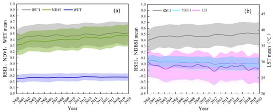 The interannual variation trend of each indicator. (a) the regional averages of RSEI, NDVI, WET indicators, and (b) the regional averages of RSEI, NDBSI, LST indicators.