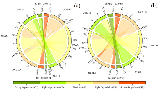 Sankey of RSEI transfer matrix from (a) 2000–2010 and (b) 2010–2020.