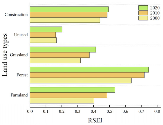 Figure 9 presents the RSEI mean values of different land use types. The mean RSEI differed by land-use classes; moreover, the RSEI of all land-use types have improved on the whole, indicating a trend of continuous environmental improvement in the past 20 years in this region. Past studies have shown that vegetation can effectively reduce soil erosivity and help increase the resistance and carrying capacity of the environment [5]. Therefore, forest areas provide favorable ecological conditions. As can be seen from Table 3, NDBSI had a negative effect on RSEI, indicating that construction and unused land contributed to lowering the environmental quality. In summary, while vegetation is closely related to the overall environmental quality, human activities accelerate the transformation and change of LULC and ultimately degrade environmental quality. Therefore, to improve the environment in the future, continuous forest restoration is essential, and land consolidation should be strengthened to optimize the balance between urban construction and sustainable development.