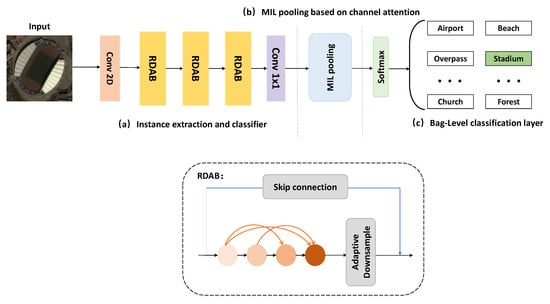 For remote-sensing scene classification tasks, each image in a training set T is converted into a collection of local patches, which are referred to as instances. Let denote each local patch that maps to the class label of instance through the instance-level classifier h; each instance is a local piece of image . Then, the instance label is changed into an image (bag) label under the common MIL assumptions, which are based on the MIL pooling function , denoted as: