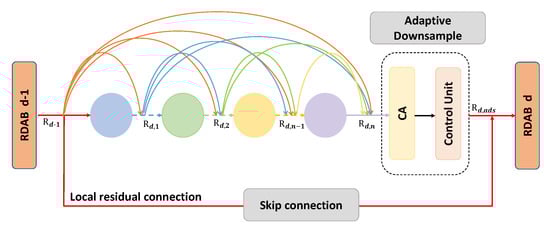 Structure of RDAB. The RDAB module consists of a dense connection block, a skip connection and an adaptive downsampling layer.