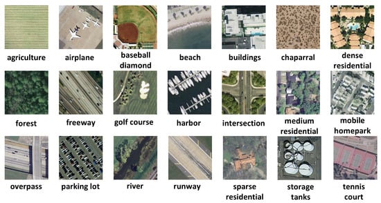 The UCM dataset was manually extracted from large images of urban areas in the USGS National Map Urban Area Imagery collection for use in various urban areas across the country. The dataset contains 21 categories. There are 100 images per category. The spatial resolution is 0.3 m, and the image size is 256 × 256. The small size of this dataset and the fact that there are many categories make it quite challenging. Figure 7 shows the categories included in this dataset.