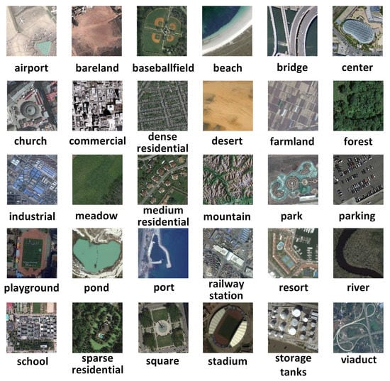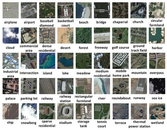 The NWPU dataset is the most challenging. It contains more than 100 areas around the world, and images from satellite photography, aerial photography and Geographic Information Systems (GIS). Additionally, it was collected from different angles, in different lighting conditions and at different times of day and seasons, so the similarity between different categories is very high. The dataset has a size of 256 × 256 per image and 45 categories of scene images. There are 700 images per category, and a total of 31,500 images. It has large spatial resolution variation: 0.2–30 m. Some examples are shown in Figure 10.