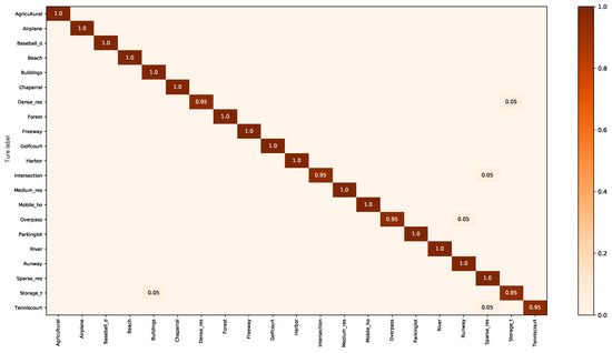 Table 2 shows the results of the proposed method and some state-of-the-art methods on the UCM dataset. Previous studies [24,46] have shown that deep learning-based methods are far superior to traditional handcrafted feature-based methods, so we do not compare the proposed approach with handcrafted feature methods here. As can be observed, the proposed MILRDA had the highest OAs under two training ratios, 98.19% and 98.81%. Under both training ratios, the enhanced methods based on the traditional VGGNet, AlexNet and GoogLeNet networks, such as TEX-Net with VGG [47], D-CNN with AlexNet [23] and DSFATN [48], perform bettered than the original methods. Some methods redesigned for remote-sensing scene images, such as ADFF [50], LSENet [22] and CIPAL [20], performed better. However, they still were 0.97%, 0.25% and 6.59% worse than our proposed MILRDA method, respectively. The numbers of parameters for DC-Net [43], although 0.16 M less than MILRDA, were 3.67% and 2.6% lower than our method for the two training ratios, respectively. since the UCM dataset is a small dataset with only 2100 images in total, the performance improvement from this small increase in parameters is within a reasonable range. Although Inception-v3-CapsNet [49] achieved 0.24% higher accuracy than our proposed method at high training ratios, it had 21.34M more parameters than our method. However, our method was still 0.6% more accurate than Inception-v3-CapsNet [49] at lower training ratios. This is because the residuals and dense connectivity included in our method improve the feature extraction rate to some extent. In addition, for CNN-based methods, the results are better when the training ratio is high, because the network can learn more features. Figure 11 shows the CM on the UCM dataset. Of the 21 categories, all achieved accuracy of 95% or higher; 16 of them achieved 100% accuracy.