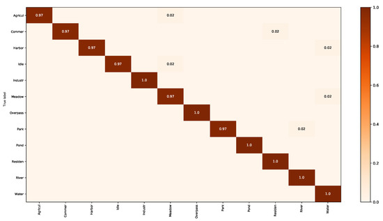 Table 3 shows the results of the proposed method and some state-of-the-art methods on the SIRI-WHU dataset. The proposed method outperformed the other methods at all training ratios. With two training ratios of 50% and 80%, MILRDA achieved accuracies of 97.16 and 98.54. Compared to some large-scale methods, such as Siamese AlexNet [25], Siamese VGG16 and Siamese ResNet50, it was superior by 13.91%, 2.66% and 1.41%. Compared with the lightweight method SE-MDPMNet [54], our method was only 0.02% less accurate at the large training ratio but 0.2% more accurate at the small training ratio. In addition, ours had 4.51M fewer parameters than SE-MDPMNet [54]. Since MILRDA constructs a feature extraction backbone based on RDAB, which can perform feature reuse well, while suppressing redundant backgrounds and increasing key object weights through attention-based MIL pooling, our method is more effective on small sample datasets. Figure 12 shows the CM on the SIRI-WHU dataset. It can be seen that all categories achieved accuracy of 95% or more; six categories reached 100%.