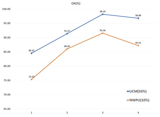 The performance of our proposed MILRDA method is influenced by the number of building blocks in the RDAB. Due to space limitations, only the OA of M in UCM with a 50% training ratio and that of NWPU with a 10% training ratio are reported here, for when RDAB equals 1, 2, 3 and 4. Figure 15 shows the relevant results. The classification accuracy peaked when the number of RDAB modules is 3. With four RDAB modules, the number of convolutional layers increased, the classification accuracy decreased and overfitting occurred. When the number of RDAB modules was four, the classification accuracy could still compete with those of some of the other methods in Table 2 and Table 5. This proves the effectiveness of the MILRDA method in feature extraction, and may also be related to the MIL pooling based on channel attention, which after all, highlights key local features.