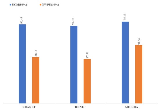 To accurately evaluate the performance of the proposed method against those of other experimental methods [1,24,47,48,49], we selected training-to-test set ratios that are equal to those used in the majority of prior research. For the UCM and SIRI-WHU datasets, the training ratios were set to 50% and 80% (50% or 80% of the randomly selected images from the dataset were used for training, and the remaining images were used for testing.); for the AID dataset, 20% and 50%; and for the NWPU dataset, 10% and 20%. To obtain real and reliable experimental results, we randomly divided the four datasets according to the training ratios and repeated the experiment ten times. The mean and standard deviation were calculated as the final results of the MILRDA network.