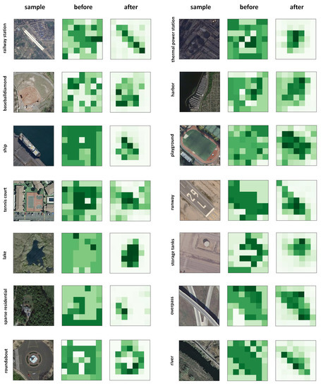 For the sake of observation, Figure 17 shows the feature maps of some categories. With the effect of MIL pooling based on channel attention, useless background information or other categories not related to bag-level labeling were suppressed. For example, for the category "tennis court," the image contains multiple objects, such as trees, residential areas and roads. With MIL pooling, regions associated with true bag-level semantic labels were highlighted, and other instances were given reduced weights, showing the effectiveness of this pooling operation. Even in the absence of MIL pooling, our proposed method still produced good feature extraction results. This is because the CA mechanism in the feature extraction backbone can help represent the key local features while expanding the corresponding regions. However, this would include some useless background regions, further demonstrating the effectiveness of MIL pooling for suppressing the weights of irrelevant objects.