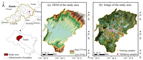 The study area was part of Sandu Town, Jiande City, Zhejiang Province, China, covering 9.72 km2 between 119°35′E to 119°38′E and 29°31′N to 29°34′N (Figure 1). Sandu Town is the third of the strong agricultural towns at the provincial level in Zhejiang Province. The region is primarily mountainous and hilly, and forest cover is about 75%. The climate is warm and humid, with an average annual temperature of 16.7 °C. Rainfall is plentiful, with an average annual precipitation of 1600 mm and 164 rainy days. Clouds are mostly concentrated in the plum rain season and are relatively abundant in June and July, influenced by rainfall and the monsoon. Rice, tea plantations, and citrus are the main crops. Rice is the main grain crop. Due to their excellent natural conditions for the soil, climate, and water quality, the first batch of Yuan Longping ecological rice planting sites in Zhejiang Province was set up in the study area and successfully trialled in 2021. The mu yield is about 200 to 300 kg higher than ordinary rice. Moreover, there are plans to continue expanding the “giant rice” area planted throughout the town in 2022. The success of the trial planting of ecological rice is significant in helping farmers to increase their yields and incomes and contribute to shared prosperity. It also offers great market prospects for ecological rice cultivation in mountainous regions.