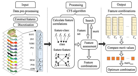 The correlation-based feature-selection (CFS) algorithm is the classical filtered method based on search strategies [43]. The core of CFS uses a heuristic search strategy and a correlation assessment function to evaluate the value of a feature subset. The heuristic strategy assumes that a good feature subset contains highly correlated features with the classification targets, but features are not correlated with each other. In this paper, the best first search strategy was used to search for features in the CFS algorithm, with the search direction set to forward selection and the initial feature subset S set to empty. The selection process is shown in Figure 4. The feature estimates (represented by the merit value) were calculated according to the feature–class and feature–feature relationships. The feature with the largest merit value was selected to S, and the next largest feature was chosen. Suppose the merit value of these two features was less than the previous merit. In that case, the second feature was removed, and so on, until the largest merit combination was identified as the optimal feature combination. The merit value is calculated by: