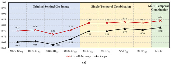 The original remote sensing images (ORIGs), SCs, and MC were classified using RF, CatBoost, and ET classifiers, respectively. Nine classification schemes could be formed: ORIGs-RF, SCs-RF, MC-RF, ORIGs-CatBoost, SCs-CatBoost, MC-CatBoost, ORIGs-ET, SCs-ET, and MC-ET. The OA and Kappa of each classification scheme based on different periods are shown in Figure 6. Overall, the classification accuracy from high to low was MC > SCs > ORIGs. In ORIGs, the relative classification accuracy in July was the lowest. However, the accuracy in this period became significantly higher in SCs. The result illustrates the improvement of spectral confusion in the dense vegetation period through feature extraction. In MC, the combination based on the ET classifier (MC-ET) had the highest accuracy, with the OA of 86% and Kappa of 0.81. The classification accuracy in the MC was ranked from high to low as MC-ET > MC-CatBoost > MC-RF.