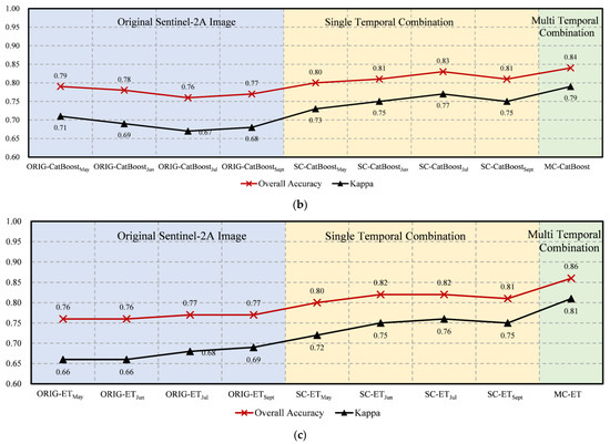 OA and kappa of different classification schemes. Classification accuracy based on (a) RF, (b) CatBoost, and (c) ET algorithms.