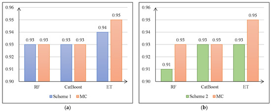Similarly, Zhu et al. [32] emphasised that pursuing feature separability or importance alone is undesirable in feature selection. This conclusion was also verified when the F1 scores of rice in this study were compared (Figure 8). It can be seen that MC had the highest F1 score in the ET algorithm. In addition, when compared to Scheme 2, the MC had a relatively high F1 score when we were using the RF algorithm. Although some F1 scores were relatively flat at 0.93, the number of features in Scheme 1 was excessive, and the lack of texture and spectral-space features in Scheme 2 did not ensure feature diversity. In general, the F1 scores were relatively lower in Schemes 1 and 2 than in MC.