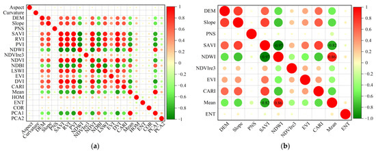 In addition, when analysing the correlation between features, the initial features were permuted and combined to form 231 feature pairs (excluding themselves), which contained a total of 40 feature pairs with very high correlation (Pearson’s correlation coefficient ≥ 0.8 or ≤ −0.8) (Figure 9a). However, the 45 feature pairs in MC contained only three feature pairs with high correlation (Figure 9b). The highly correlated feature pairs decreased from 17.32% to 6.67%. This shows that the MC has low redundancy, and OPFSM can provide a new reference for the feature selection of multitemporal images.