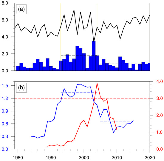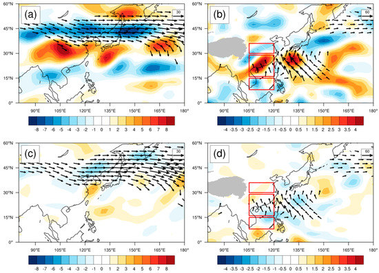 where , , and represent averaged 850 hPa relative vorticity anomalies over (30–36°N, 105–120°E), (16–29°N, 105–120°E), and (8–15°N, 105–120°E), respectively. The above three areas are denoted by the red boxes in Figure 7b,d. The EAP index is 1.187 in S1 and −0.002 in S2, respectively. The large difference in the EAP index between S1 and S2 suggests that the intensity of the EAP teleconnection experienced a significant weakening since the mid-2000s. Furthermore, the weakening of the EAP teleconnection is partly attributed to the weakening of its intensity and partly attributed to its eastward shift.