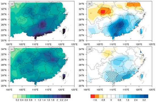 East Asian summer monsoon (EASM) exhibits significant interannual and interdecadal variabilities, which have a great influence on summertime precipitation in East Asia [1]. Huang et al. gave a comprehensive and systematic summary of the spatiotemporal features, processes, and causes of the EASM variability and pointed out that the EASM has significant variabilities on interannual and interdecadal time scales [2]. Moreover, the EASM experienced an interdecadal weakening around the late 1970s, while summertime precipitation increased in the Yangtze-Huai River Basin (YHRB) and decreased in North China correspondingly. Summertime precipitation in South China (SC) increased after 1992 and decreased in YHRB after 1999 [3]. Correspondingly, the correlation between interannual variations of the EASM and ENSO became unstable [4]. South China (SC) is located at the east of the Qinghai-Tibet Plateau and south of YHRB. Due to the interactions between tropical and middle- to high-latitude weather systems, the weather and climate in SC are complicated and diverse. SC is the area with the amplest precipitation and the longest rainy season in China. Severe drought and flood disasters associated with abnormal precipitation cause huge losses of lives and properties and greatly influence local economies [5,6,7,8].