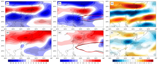 Composite differences of (a,d) 200 hPa geopotential height (unit: gpm), (b,e) 500 hPa geopotential height (unit: gpm), and (c,f) 200 hPa zonal wind (unit: ) between wet years and dry years. (a–c) for S1 and (d–f) for S2; dots indicate the regions exceeding 95% confidence level; red and black lines in (b,e) indicate composites of the WPSH feature line for wet and dry years, respectively).
