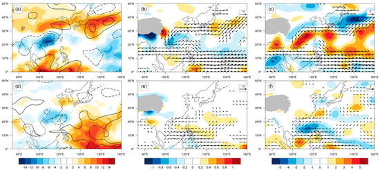 Composite differences of (a,d) vertically integrated omega from 850 to 500 hPa (contours with the interval of 2, ) and OLR (shading, ); (b,e) vertically integrated moisture flux from 1000 to 500 hPa (vectors, ) and its divergence (shading, ); and (c,f) 850 hPa wind (vectors, unit: ) and relative vorticity (shading, ) between wet years and dry years. ((a–c) for S1; (d–f) for S2; significant values exceeding the 95% confidence level are displayed; the dashed/solid lines suggest values larger/smaller than zero in (a,d)).