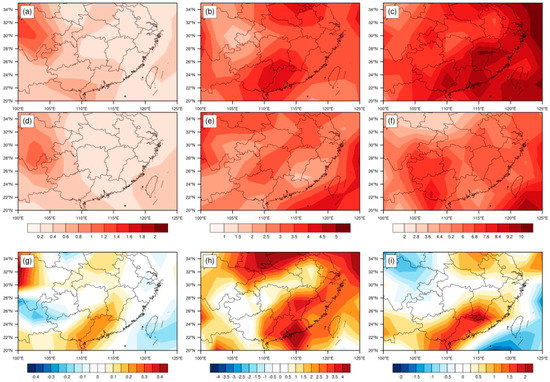 Standard deviations of vertically integrated moisture flux divergence from 1000 to 500 hPa ((a,d,g); ), vertically integrated omega from 850 to 500 hPa ((b,e,h); ), OLR ((c,f,i); ) in S1 (a–c); and S2 (d–f) and the respective difference between S2 and S1 (g–i).