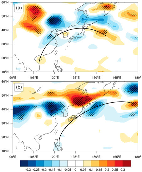 Traditional studies regard the EAP teleconnection as a free Rossby wave train propagating from the subtropics to the mid latitudes in the lower troposphere [29,31]. To explain in a clearer way the interdecadal variation of the EAP teleconnection from the perspective of energy, the composite differences in CK vertically integrated from 1000 to 100 hPa between wet years and dry years are displayed in Figure 8. Note that positive CK indicates that fluctuations are easier to develop by extracting kinetic energy from basic flow. In S1, positive CK is centered at 150–160°E, 35–40°N and 105–115°E, 15–20°N (Figure 8a). In S2, the positive CK shift to the east and are centered at 170–180°E, 35–45°N and 125–135°E, 25–35°N (Figure 8b). Traditional studies regard the EAP teleconnection as a free Rossby wave train propagating from the subtropics to the mid latitudes in the lower troposphere [29,31]. Therefore, it is obvious that the CK shift to the east in S2 contributes significantly to the eastward shift of the EAP teleconnection.