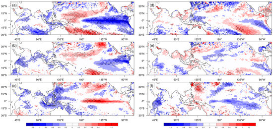 It has been found that the eastward shift of EAP teleconnection is mainly forced by the shift of related SSTA [54,55]. Figure 9 shows the composite differences of SSTA (unit: K) between wet and dry years from the prior winter (DJF) to the subsequent summertime (JAS). In S1, the EAP teleconnection is connected with the transitional phase from La Niña to El Niño and from “North-warm-South-cold” to “North-cold-South-warm” in the Indian Ocean (IO), as well as a significant cooling phase over the western Pacific (WP) (Figure 9a–c). In S2, the EAP teleconnection is connected with the El Niño Modoki [56] decaying and a cooling phase in the IO, as well as a warming phase over WP (Figure 9d–f).
