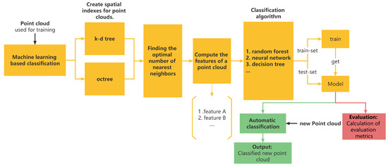 Point cloud classification methods based on machine learning are supervised approaches, hereafter abbreviated MLPCC. Compared to the filtering algorithm, these types of algorithms require prior labeling of the point cloud. A typical workflow is shown in Figure 2 and consists of five main steps. The first step is to determine a spatial index for each point using, for example, a k-d tree to reduce the neighborhood search time. In the second step, the appropriate number of nearest neighbor points is selected. The third step consists of labeling the point cloud by evaluating its features, as described in Table 1. In the fourth step, the model is trained based on this information. Finally, the trained model is used to process the original data.
