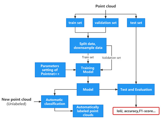 The classification based on deep learning, abbreviated as DPCC, can be divided into two types according to the input to the neural network. Whereas the first method converts the point cloud to another format as input (two-dimensional images or 3D voxels), the second one makes use of the original point cloud to avoid an increase in data volume and a loss of information during the conversion. In this contribution, we use an extension of PointNet [32], which is a deep learning point cloud classification/segmentation algorithm that utilizes the scattered point cloud directly as input. PointNet++ uses neighborhood information for feature extraction to face the generalization ability of this algorithm in complex scenarios. The idea behind PointNet++ is to first divide the point set into multiple overlapping subsets in space and use PointNet to extract fine local features from each subset. This process is repeated several times in a hierarchical manner, i.e., the output point set of each layer is used as the input point set of the next layer. This multilayer process generates point sets that contain rich contextual information. The workflow is summarized in Figure 3. The first step splits and downsamples the large-scale TLS point cloud. The second step sets the parameters of PointNet++, such as the training epoch. The training of the model chosen is performed in the third step. The fourth step tests the trained model using the test data set. Finally, the fifth step quantitatively evaluates the test results, using the metrics presented in Section 2.3.