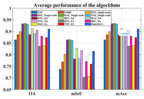Figure 7 describes the average classification results of each algorithm based on the OA, mIoU, and mAcc for classifying ground points. Here, the SMRF algorithm performs slightly better than the CSF algorithm in all metrics (a difference of approximately 0.02). Regarding the MLPCC algorithm based on the single-scale , the average classification ability of NNC, RFC, and DAC is very similar compared to the DTC classification algorithm. However, when the value is computed with either the Ed or E method, the classification performance of the DAC algorithm decreases significantly compared to the RFC and NNC algorithms (0.05 for the OA and 0.1 for the F1 score). From this perspective, the RFC and NNC algorithms outperform the DAC algorithm. Regarding the DPCC algorithm, the average classification performance of PointNet++ is in the middle to upper range of these classification algorithms. It performs 0.02 worthier than the single-scale method RFC, DAC, and NNC algorithms for the OA and mAcc metric and 0.05 for the mIoU. To summarize the results of Figure 7, the classification performance of MLPCC based on single scale is better than that of DPCC, which is itself better than that of the FPCC algorithm for the average metrics.
