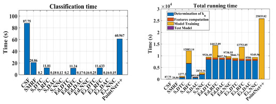 A detailed analysis of the running time is provided in Figure 8 (right). As expected, the FPCC algorithms have the shortest running time and the DPCC algorithm the longest one. Here, the determination of the value is shown to be time-consuming. Exemplarily, the RFC algorithm takes more than 50% of the total running time in determining the values and training the model compared with DTC and NNC methods, which are one-third faster than the RFC, independently of whether the E or the Ed method is used. Almost all of the computing time for the PointNet++ algorithm (which is more than two times higher than for the other algorithms) is used for model training. This method is, thus, less appealing than the other one regarding its computational performance.