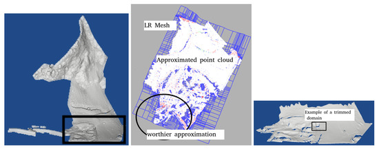 Figure 9 (right) shows the final mathematical LR B-splines surface. We mention that the algorithm may try to extrapolate the gaps due to missing observations after the filtering of outliers and non-ground points, creating artificial oscillations. Accordingly, trimming is used, which is a popular method within the context of computed-aided design. This is illustrated by the voids, which correspond to the non-ground points eliminated prior to the surface approximation and non-fitted.