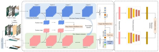 The three schemes mentioned heavily focus on the collection of historical experience, but Lee et al. [22] argued that it still leads to more forgetting due to the restriction of future events. Therefore, to alleviate catastrophic forgetting, they have learned more representative features in the first instance. Inspired by this, obtaining meaningful features within the continual learning process becomes critical to alleviating catastrophic forgetting. For remote sensing scene images, there is a large quantity of land cover types and ground objects covered in the same imagery, and the inter-class similarity and intra-class diversity cause scene classification tasks to be more challenging. In addition, the images acquired from different satellites have the problems of variation in illumination, backgrounds, scale and noise, which further increase the discrepancy of scene images across different datasets. Facing the dramatic variations in images, how to extract discriminative features with limited annotated samples becomes the primary goal.