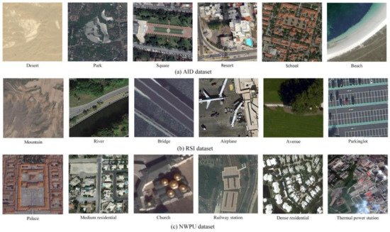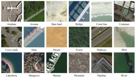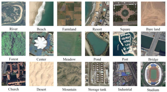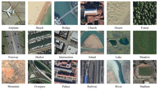 - NWPU-45 dataset: the NWPU-45 dataset was proposed by Cheng et al. [48] in 2017 for remote sensing scene classification. This large-scale dataset contains 31,500 images and covers 45 scene categories, with 700 images in each category. The images in this dataset showed significant differences in spatial resolution, viewpoint, background, and occlusion, etc. The within-class diversity and between-class similarity problem means the classification task on this dataset becomes more challenging. The sample images of NWPU dataset are shown in Figure 3.