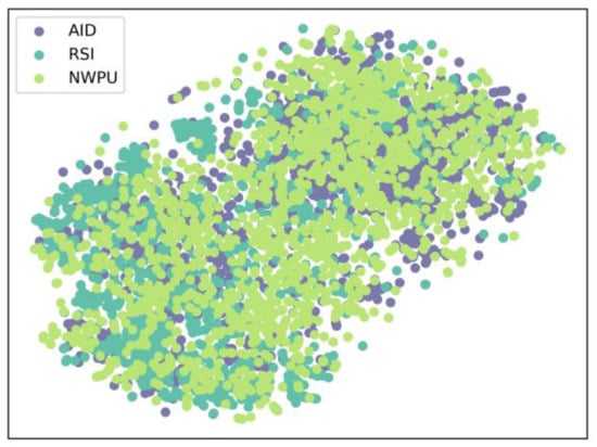 For continual learning across different datasets, we set the AID dataset as the first step of the scene classification task; the RSI-CB256 and NWPU-45 datasets were subsequently added in the second and third steps of the task, respectively. As can be seen in Figure 5, it is a challenging task to perform continual learning across different domain datasets. We split the labeled samples of three datasets into the labeled supervised training set, unlabeled contrastive learning, and testing set. In order to simulate the data accumulation, we kept all the data used in the previous step for the next step. Specifically, we randomly selected 5% labeled and 5% unlabeled samples from the AID dataset for the first step of model training, and 5% samples for testing. In the second step, we used all samples from the AID dataset in the previous step and supplemented the RSI dataset with 5% labeled samples and unlabeled samples for training, and 5% samples for testing. Similarly, the NWPU45 dataset was supplemented in the third step with 5% labeled samples and 5% unlabeled samples for training, and 5% samples for testing. We normalized the image size of each dataset to 256 × 256 and performed random image augmentation. The random augmentations strategy adopts resize, random crop, rotation and color jitter, etc.